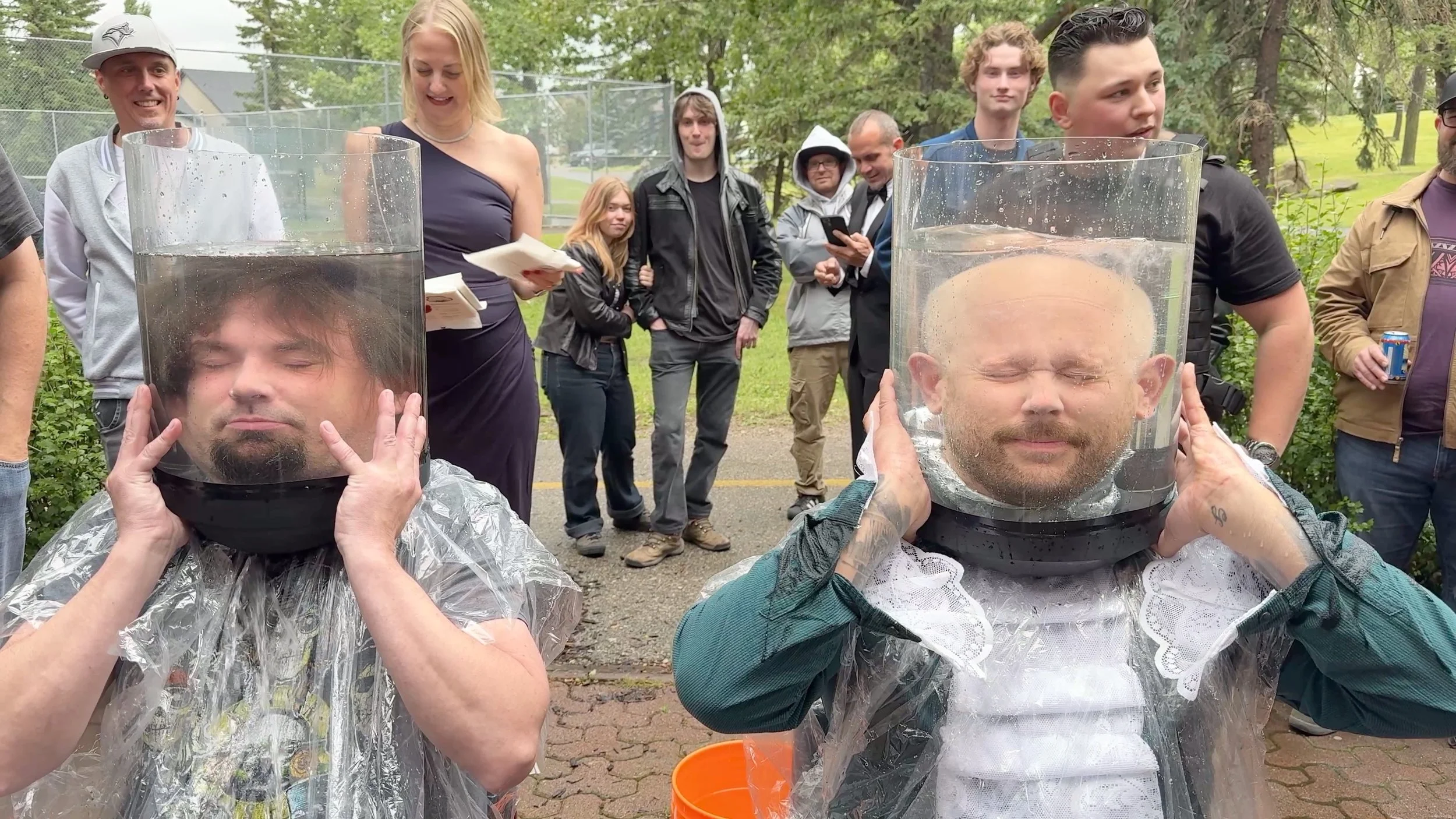 Another online clip straight from Japan. I saw it and thought, “wow, someone could die doing this! Let’s give ‘er a go!” This one required precision, teamwork, and trust, which made it a poor fit for everyone involved. Especially after they’ve been drinking. Four people were involved in total, with two competitors going head to head, while we tried to drown them. How it worked was that I made a cylinder that fit over your head with a scuba neck at the bottom (both myself and Natalie tested these out and it was god damn terrifying! Check my test vid here, and Nat’s test vid here). We would then pour water in, and whoever held their breath the longest won. I also added a bonus. I would crack an egg into the water, and if you could catch it in your mouth, I would give you $20. No one could get it though.