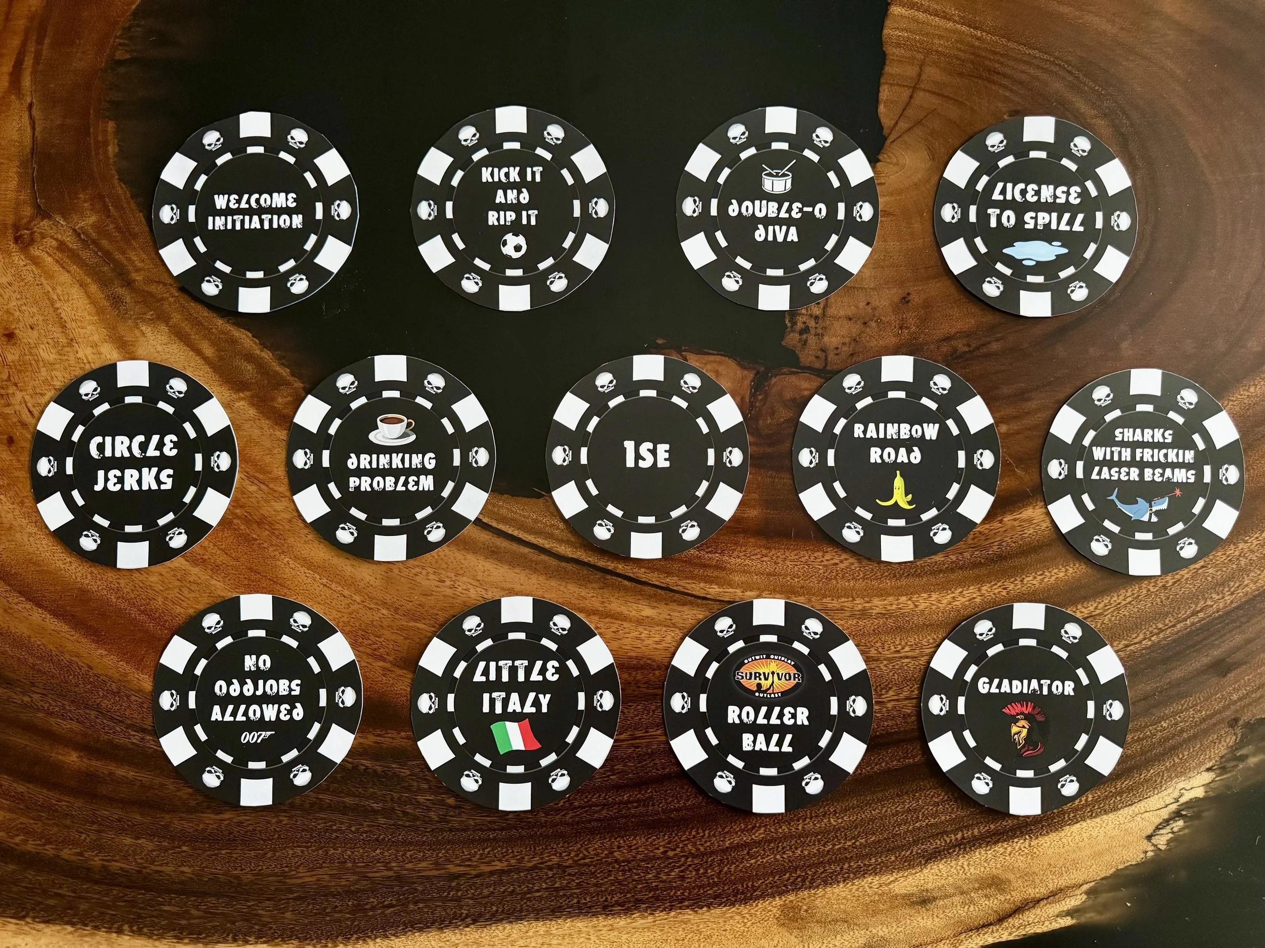 The method was the same: red chips in, green poker chip being the designated GoPro video recorder of the event, blue poker chip is a judge, and the infamous black poker chip was unlucky. One twist... in season I, If they didn't complete, or did less than 50%, they faced the judge(s) and received a slap(s) with the SchneL/FAH-Q oak hazing paddle. I found there weren't enough spanks in season I, so I upped the ante... now people had to complete at least 80% of the event rather than 50%.