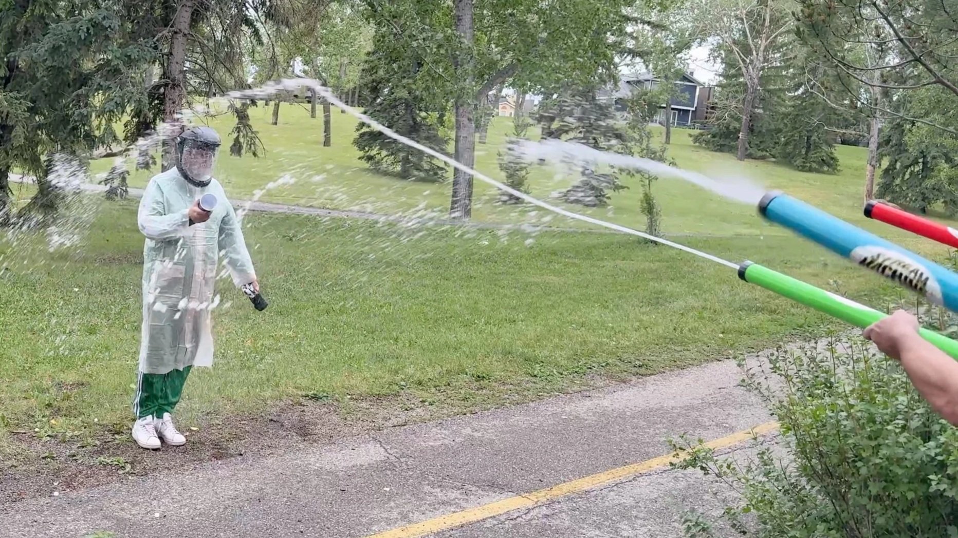 This was an old Silent Library event and I’ve wanted to do it since Season I. I gathered all the materials to do so, and we tested Kurt in ways science never intended. The challenge involved launching three substances at him while he endured the storm wearing a mask, crotch cup, and rain jacket, trying to catch the liquids shit at him in a solo cup. First, we used tube water guns to shoot water dyed brown to resemble coffee so it wouldn’t stain everything in sight. Second was shooting him with water mixed with Titanium Dioxide to create fake milk without the smell (see the vid of how it works here). Third was supposed to be sugar fired from my t-shirt cannon (watch Natalie test it on me at home before the game here). Unfortunately the sugar missed slightly, so we improvised and shot him with two t-shirts after as well. Through all of it, Kurt completed the challenge like a man who had accepted that this was simply his life now. He did win a retro neon phone though!