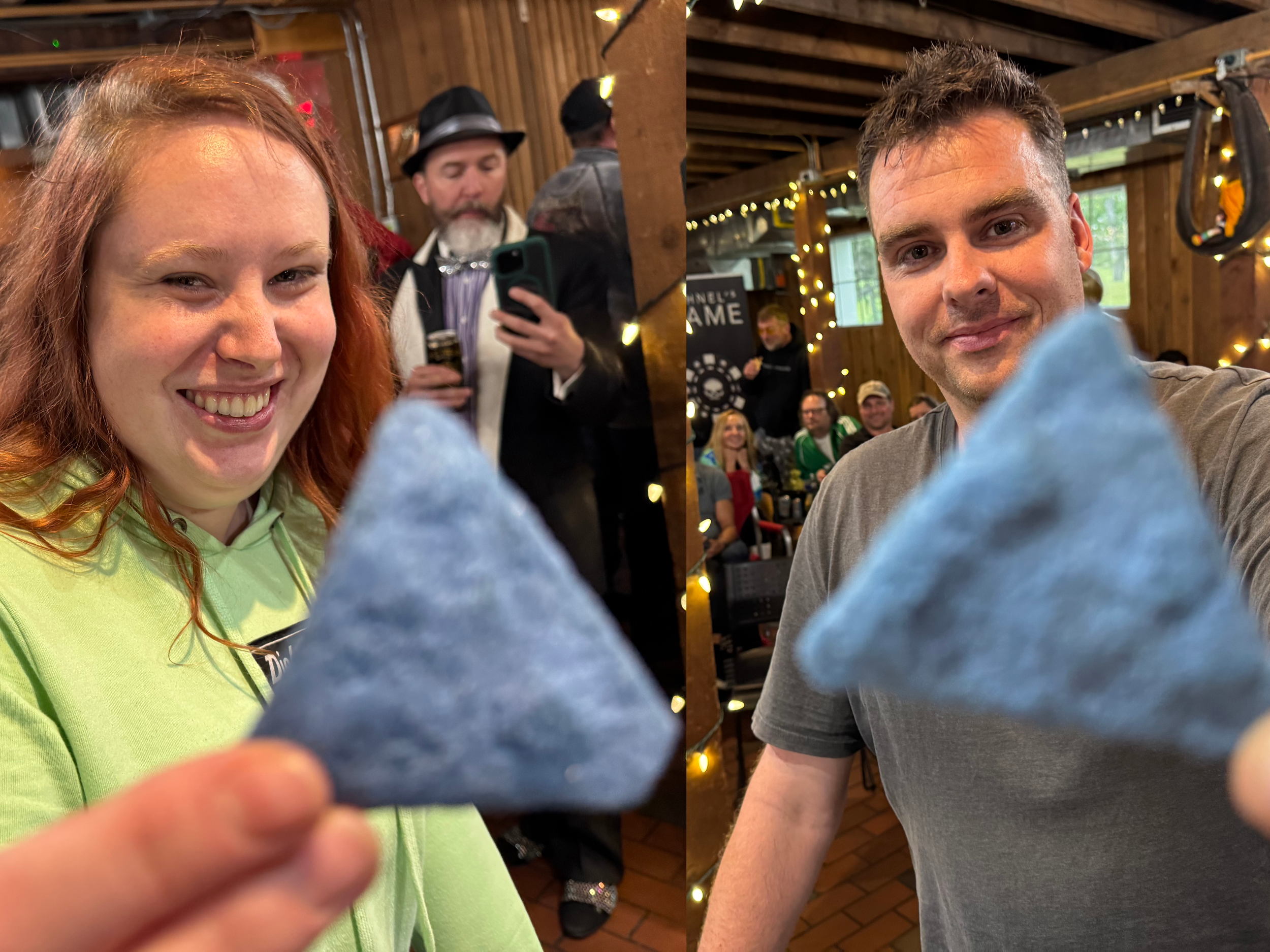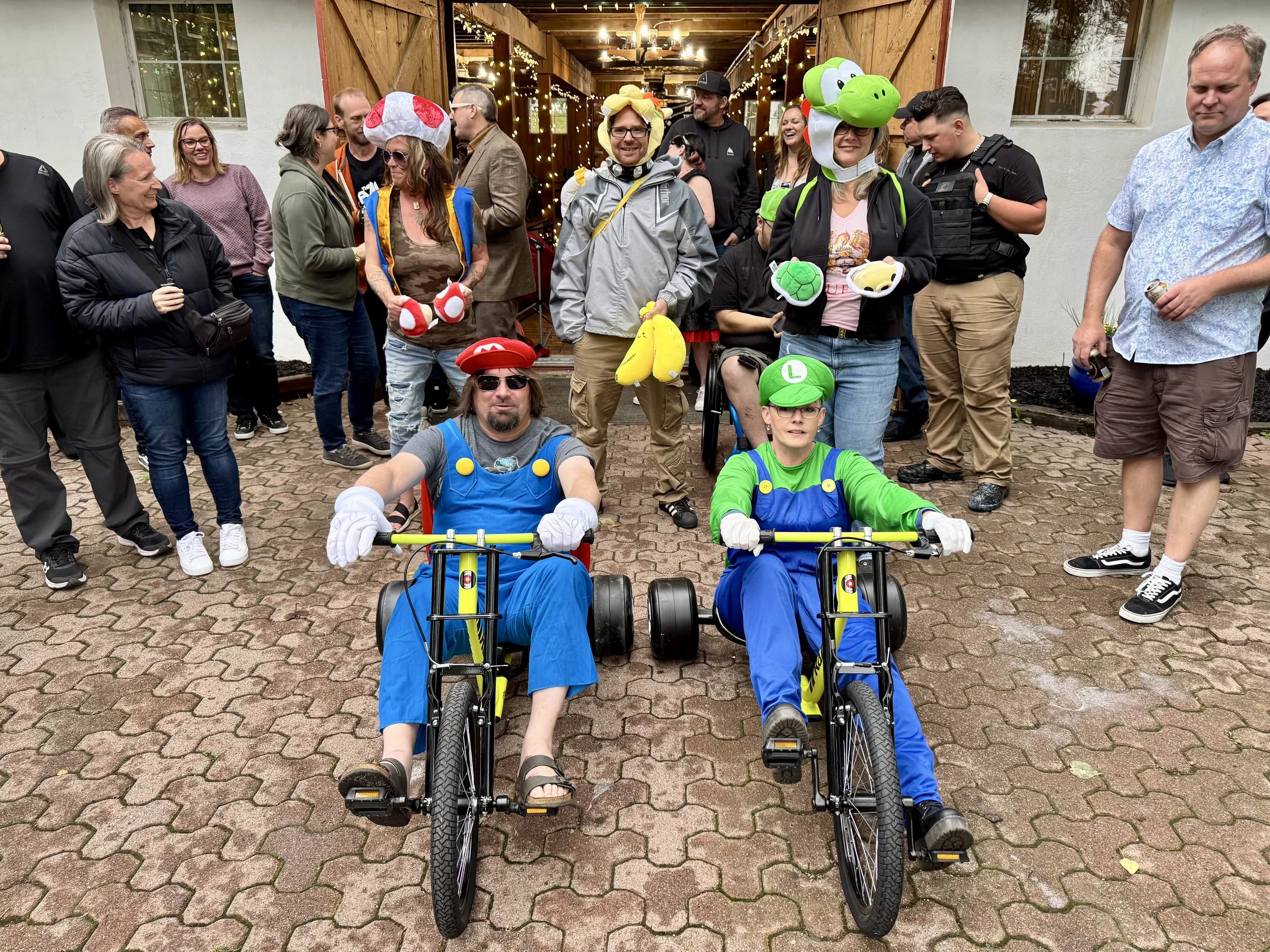 I’ve been wanting to do this one for six years! Originally set as Ian versus Andrea in an adult big-wheel Mario Kart race, but Eric used his Daniel Craig James Bond Golden Ticket to steal the event like the Bond villain he is. So we pivoted, dressed them up as Mario and Luigi, and sent them to the track. Judging duties were handled by Jodi as Yoshi with two Koopa shell stuffies to throw, Jeff as Bowser with two banana stuffies to throw, and Cindy as Toad with two mushroom stuffies to throw. They took their responsibilities with surprising seriousness considering the circumstances. Andrea won cleanly. Eric somehow escaped punishment through what can only be described as administrative failure by myself. We will correct this injustice by spanking him at the start of next year. Andrea won a PowerGlove as a prize.