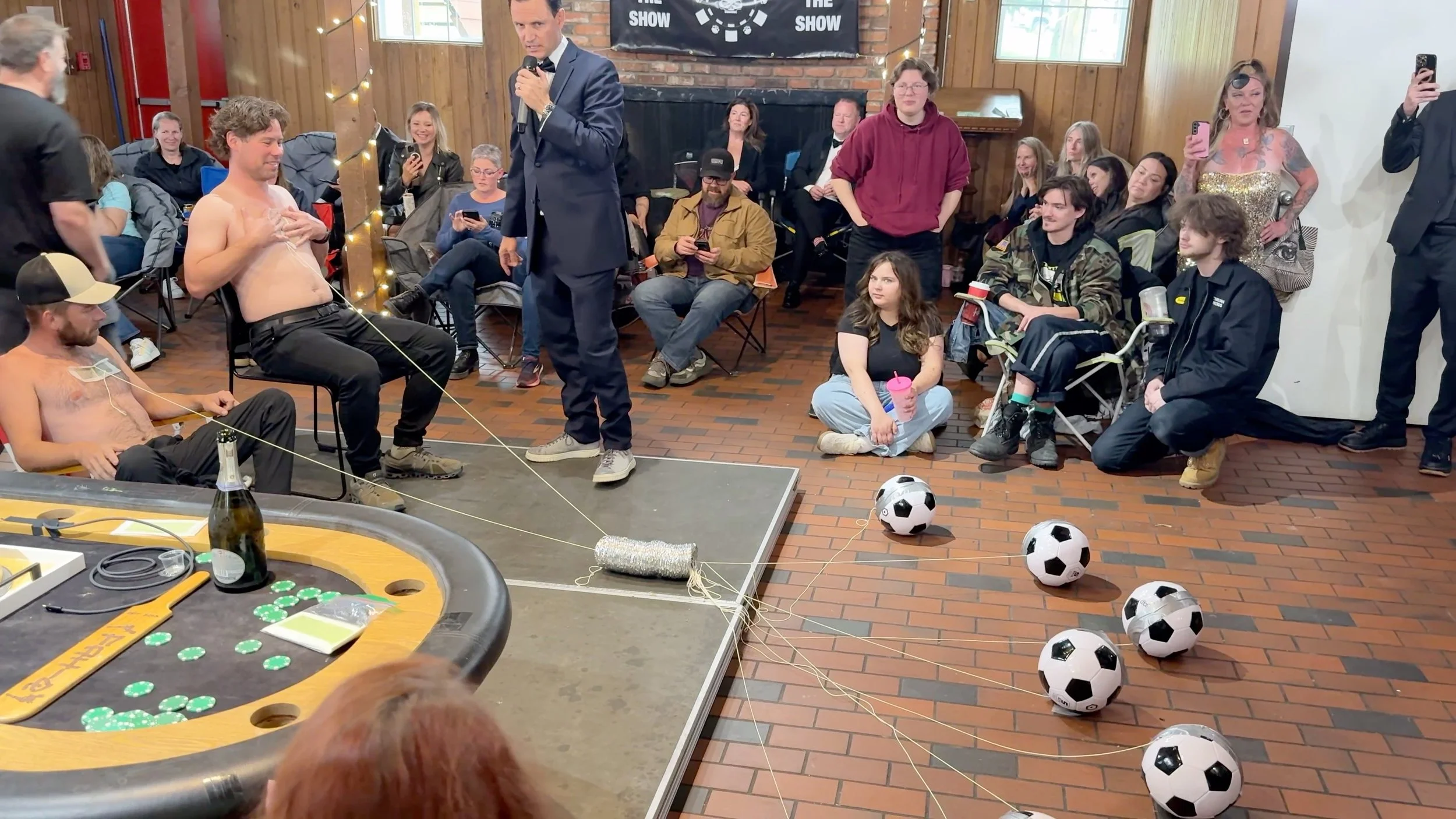 I saw this beautifully stupid combination of soccer balls and wax strips online in a clip and thought, “this looks like a blast!” Garrett and Aaron pulled the black chips and when I said “remove your shirts,” they knew full well there was no dignity waiting on the other side of this one. The concept was a wax strip was placed on your chest, with a string running through a tube on the floor to eight soccer balls attached on the other side. They would point to a ball to kick, and one of the judges would boot it.