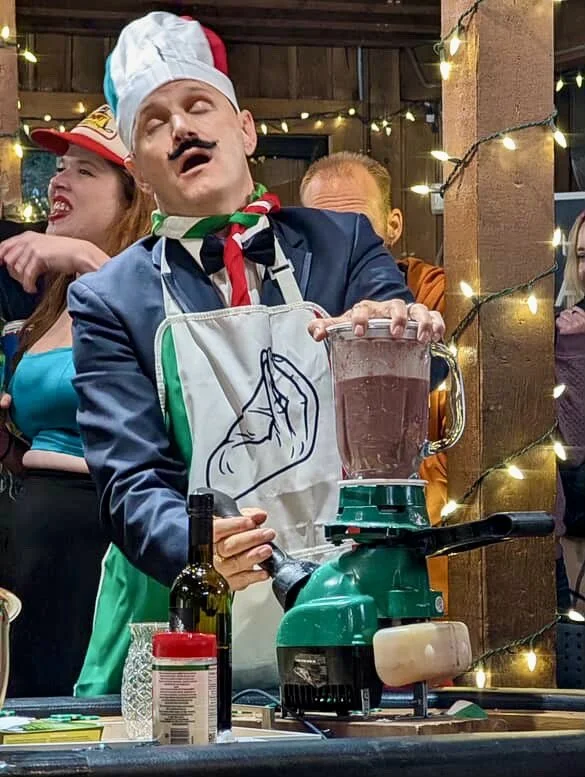 Sometimes an event is less about competition and more about performance art. Enter Little Italy. I brought out the DaqWaq, a two-stroke gas-powered blender invented by the mad scientist himself, Ian Byers. Into the blender went pizza, cannoli, Michelina’s fettuccine alfredo, parmesan cheese, and chianti red wine, and I timed the whole thing perfectly to Dean Martin’s That’s Amore. I was dressed for the occasion in an Italian chef hat, Italian neckerchief, fake moustache, and an apron that politely translated to “fuck you” in Italian. It was one of the more cultured moments of the night. Michelle stepped up and drank it down like a champion… but unfortunately, it made a return appearance right away. Three spanks were issued. Mamma mia!